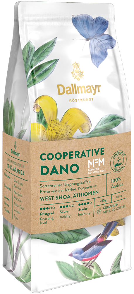 Exklusiv von der neuen Dallmayr Kaffee-Kooperative aus dem Projektgebiet Dano in Äthiopien. Dort bauen wir gemeinsam mit „Menschen für Menschen" eine nachhaltige, ertragreiche Kaffeeregion auf - und unterstützen so das Land, das uns als Kaffeeröster schon seit über 60 Jahren begleitet. Wir schaffen rund 50 neue Arbeitsplätze, sorgen für gute Einkommen und verbessern so die Perspektiven für die Bauernfamilien vor Ort.