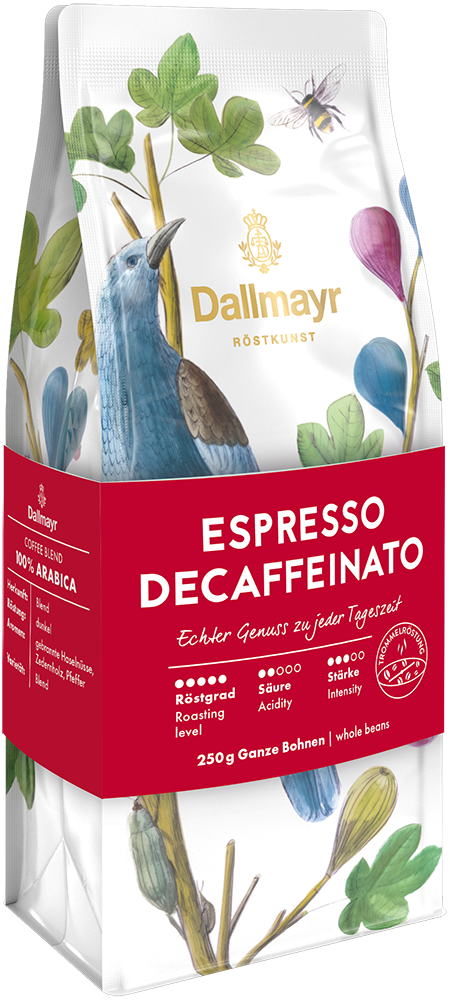 Unbeschwerter Genuss zu jeder Tageszeit: Dallmayr Espresso Decaffeinato ist eine raffinierte Arabica- Spitzenmischung in typischer, dunkler Espresso-Röstung. Besonders schonend mit Quellkohlensäure entkoffeiniert. Das Aroma besticht durch Nuancen von gebrannten Haselnüssen, Zedernholz und Pfeffer. Schmeckt pur, als Cappuccino oder Latte Macchiato.