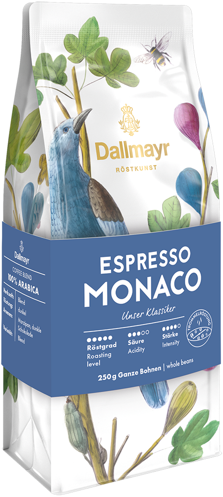 Bayerisch-italienisches Lebensgefühl in der Tasse! In Dallmayr Espresso Monaco verbindet sich südländische Kaffeekultur mit dem typischen Dallmayr Aroma: Edle Arabica-Bohnen werden auf original italienische Art behutsam lange und intensiv geröstet. Ein voller, feinherber Genuss, ideal auch als Cappuccino oder Latte Macchiato.