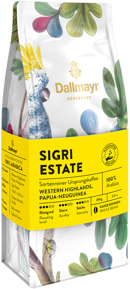 Ein exotischer Ursprungskaffee von „der Insel der Paradiesvögel“: Dallmayr Sigri Estate aus Papua Neuguinea. Die gleichnamige Kaffeeplantage wurde bereits 1950 gegründet und hat den Ruf, die besten Arabica-Kaffees des Landes zu produzieren. Vollendet durch die Dallmayr Röstkunst, erinnert das Aroma an Papaya, Mandel und Vanille. Ein vollmundiger Genuss mit feiner Kaffeesäure und weichem Abgang.